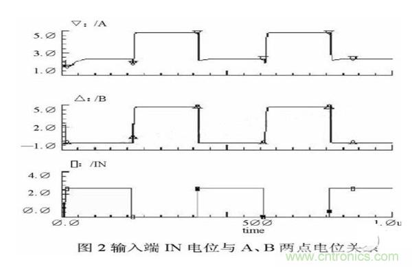 实际上,B点电位与负载电容和电容Cboot的大小有关,可以根据设计需要调整。具体关系将在介绍电路具体设计时详细讨论。在图2中给出了输入端IN电位与A、B两点电位关系的示意图。