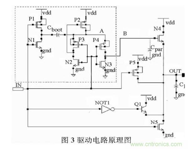 图3中给出了驱动电路的电路图。驱动电路采用Totem输出结构设计,上拉驱动管为NMOS管N4、晶体管Q1和PMOS管P5。下拉驱动管为NMOS管N5。图中CL为负载电容,Cpar为B点的寄生电容。虚线框内的电路为自举升压电路。