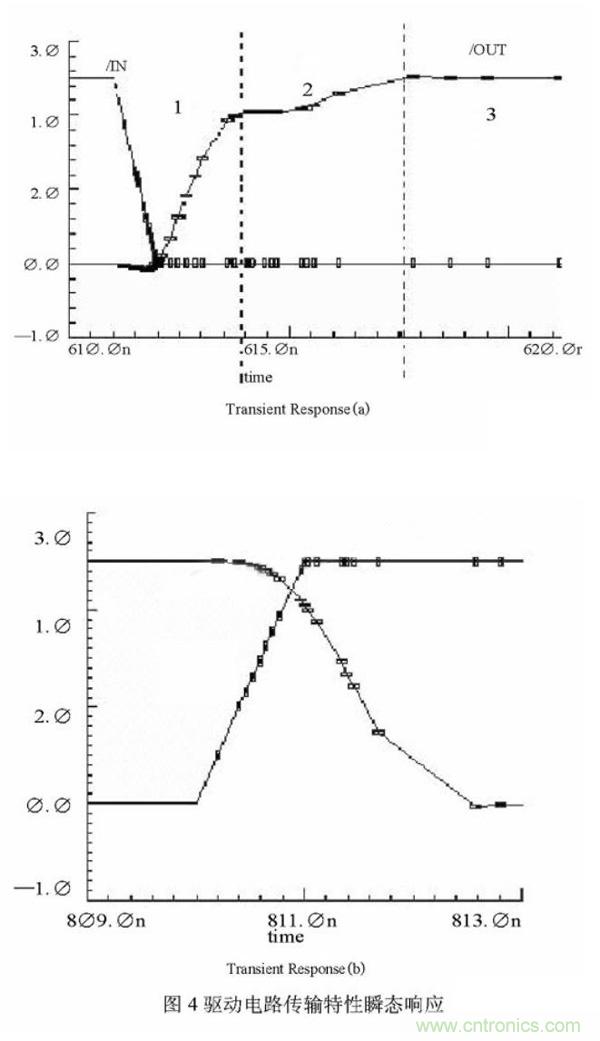 驱动电路的传输特性瞬态响应在图4中给出。其中(a)为上升沿瞬态响应,(b)为下降沿瞬态响应。从图4中可以看出,驱动电路上升沿明显分为了三个部分,分别对应三个上拉驱动管起主导作用的时期。1阶段为Q1、N4共同作用,输出电压迅速抬升,2阶段为N4起主导作,使输出电平达到VDD,3阶段为P5起主导作用,维持输出高电平为VDD。而且还可以缩短上升时间,下降时间满足工作频率在兆赫兹级以上的要求。