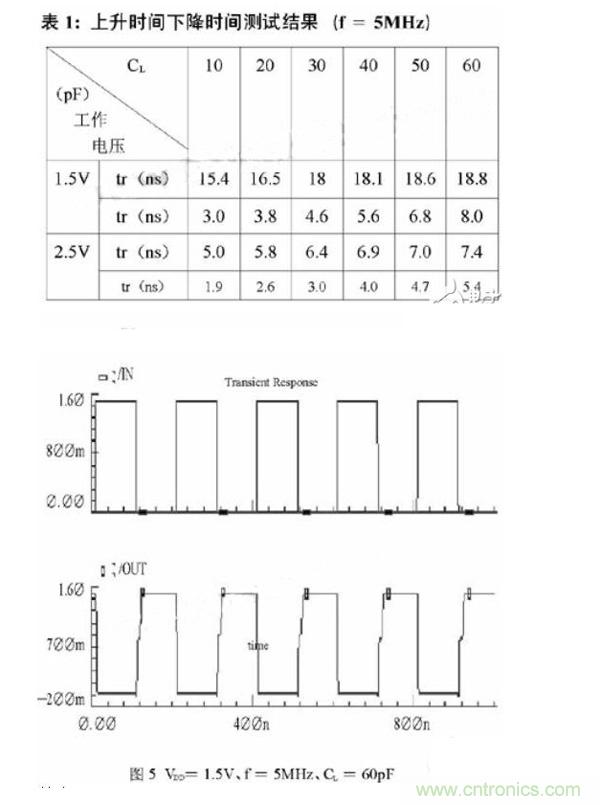 驱动电路基于Samsung AHP615 BiCMOS工艺设计并经过Hspice仿真验证。在表1中给出了电路在不同工作电压、不同负载条件下的上升时间tr和下降时间tf 的仿真结果。在图5中给了电路工作在输入电压1.5V、工作频率为5MHz、负载电容60pF条件下的输出波形。