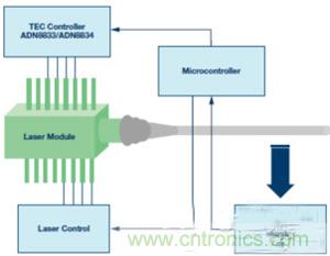 上述系统的一般框图如图1所示。激光二极管、TEC和热敏电阻位于激光模块内部。TEC控制器ADN8833或ADN8834读取热敏电阻的反馈电压,并向TEC提供驱动电压。使用微控制器监测和控制热环路。注意,热环路也可以在模拟电路中构建。ADN8834内置两个零漂移斩波放大器,可将其用作PID补偿器。