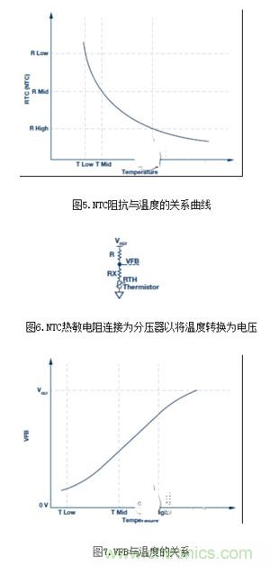 图5显示了负温度系数(NTC)热敏电阻在温度范围内的阻抗。由于它与温度具有相关性,因此可将其连接为分压器,从而将温度转换为电压。典型连接如图6所示。当RTH随温度而变化时,VFB也会变化。增加一个Rx与热敏电阻串联,便可相对于VREF将温度电压传递函数线性化,如图7所示。必须将其与??榭悄诓康募す馄鹘裘荞詈?,隔绝外部温度波动影响,使其能精确检测温度。