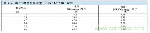 充电电压(无温度补偿):ENYCAP 196 HVC混合储能电容器没有温度补偿也能充电。这些情况下应考虑一些约束条件,以便在必须支持极宽温度范围时延长使用寿命。如果充电电压完全不可调节,则应设置充电的上限电压及温度限值;通??缮柚梦康缧?.4 V和60 °C(图2)。在较低温度时使用该固定电压进行充电不会损害电芯。但在较低温度时,充电效率降低且混合电容器无法满充。