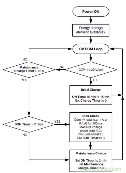 当充电量超过标称电量的5%时就需要初次充电。图4流程图中的5-15分钟“ON时间”是恒压充电的典型时间范围,具体取决于应用的电能需求。初次充电可使混合电容器足以满足下次使用的要求。如果所需电能显著少于规定的每电芯115 J(例如90 F电芯),则可减少“ON时间”。在后备使用之后或在系统停电几天或几星期之后很可能需要初次充电。