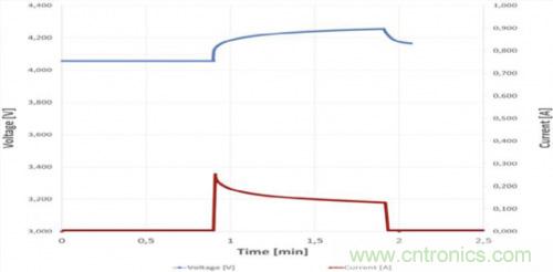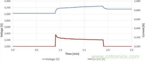 图6a.6小时后的首个维护充电脉冲(1分钟)(90 F 4.2 V系统示例)