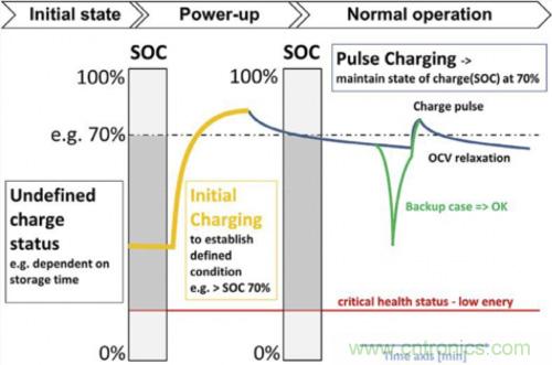注:第2-5步补偿自放电效应并通过这种涓流充电使储能元件保持健康状态,同时还维持更长的时间。