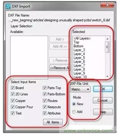 图 5:PCB 设计工具(如这里介绍的 PADS)需要能够使用 DXF 格式控制所需的各种参数。