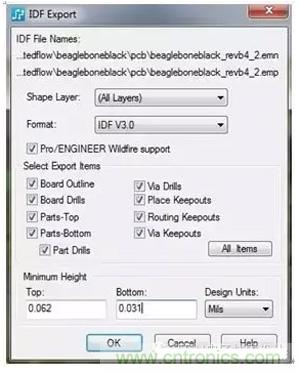 系统需要能够以与 DXF 参数设置类似的方式,来控制 IDF 文件中将包含的内容,如图 6 中所示。如果某些元器件没有高度信息,IDF 导出能够在创建过程中添加缺少的信息。