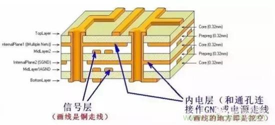 通常简称为内电层,仅在多层板中出现,PCB板层数一般是指信号层和内电层相加的总和数。与信号层相同,内电层与内电层之间、内电层与信号层之间可通过通孔、盲孔和埋孔实现互相连接。