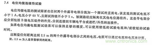 ③ISO 6469-3 Electrically propelled road vehicles-Safety specification-Part3:Protection of persons against electric shock GB/T 18384-3对等电位连接的设计要求、测试要求在标准6.3.1和6.9中做了明确规定。