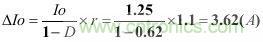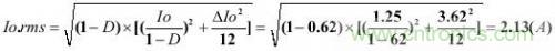 假设已知连续工作模式的反激变换器,其输出电流Io为1.25A,纹波率r为1.1,占空比D为0.62,开关频率为60kHz,由此可以计算次级纹波电流ΔIo和有效值电流Io.rms。