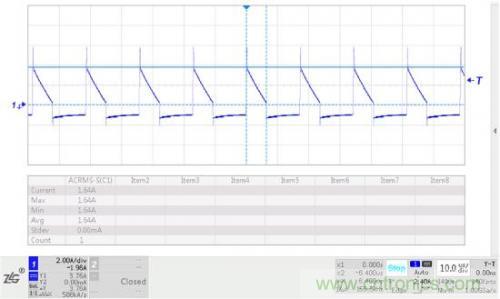 测试电解电容纹波电流时,需将电容引脚穿入电流探头中,通过示波器可读得交流有效值。本设计实例的纹波电流测试结果如图3所示,示波器读得有效纹波电流为1.64A,与理论设计接近。因此理论计算具有较大的工程指导意义。