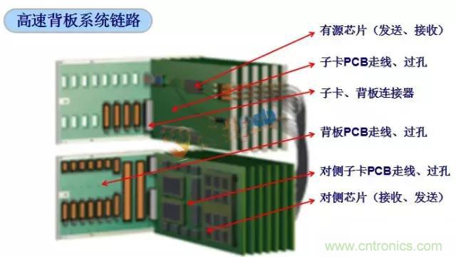 高速背板的设计除了关注背板PCBA设计要素以外,需要关注整个系统高速信号互连链路的设计,典型的高速信号链路参考下图: