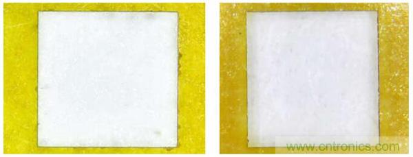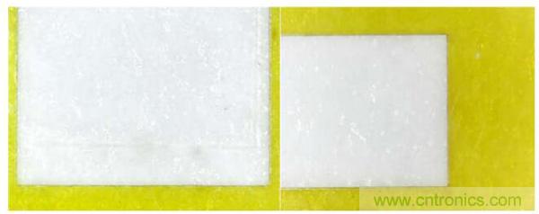 图2.紫外激光 PI 膜开窗(左图为 0.5mil 厚,右图为 1mil厚)