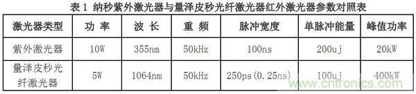皮秒光纤激光器是在超快激光基础上开发出的新一代激光器,尤其是近年来光纤器的研制成功,标志着激光技术的一次飞跃进步,与固体纳秒激光相比,皮秒光纤激光器具有以下优点:1.激光脉冲宽度更窄,仅为 10^-12S,从上述材料吸收激光能量转化为热能的扩散距离公式可知,这将大大减小激光加工材料时的热扩散距离,降低激光对材料的热损伤;2.因脉冲宽度变窄,激光单脉冲峰值功率成倍增加,提升了激光加工材料的能力;3.光纤激光器以细小的光纤作为激光的传输和放大介质,与固体放大结构相比,不仅工作稳定,免除了周期性的调校工作,降低了维护成本,而且结构小巧,制造成本相对较低。表1是量泽激光公司研制的光纤器与目前市面上主流的纳秒级固体紫外激光器的参数对照: