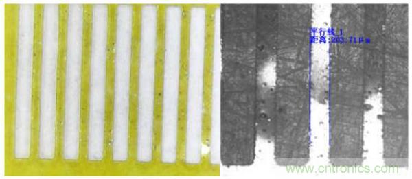 图3.皮秒光纤激光器PI 膜开窗(左图为 0.5mil 厚,右图为 1mil 厚)