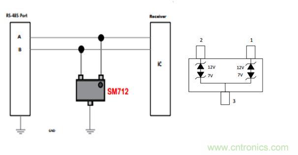 对RS485接口的特点是收发电平的不对称,为7V 和12V,所以需要专门设计不对称的?;ば酒?,而SM712 SOT-23封装,专为?;ぞ哂蟹嵌猿乒ぷ鞯缪梗?7V至12V)的RS-485应用而设计,使其免受静电放电(ESD)、电气快速瞬变(EFT)和雷电引致的浪涌电流带来的危害。 它能吸收高于IEC 61000-4-2国际标准规定之最高级别的反复性ESD放电 30KV,无需担心其性能发生减退,并可在极低的箝位电压下安全地耗散19A的8/20μs波形浪涌电流(IEC61000-4-5)。