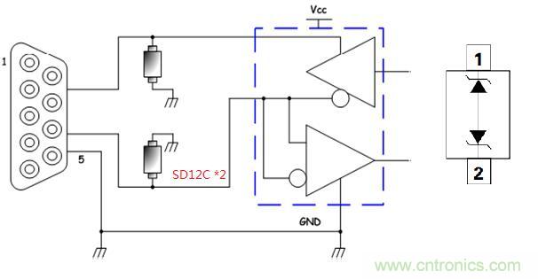RS232接口一般为内部配置接口,或短距离低速通信口,但此接口经常插拔,需要采用功率300W以上产品进行静电和浪涌保护,所以需采用SOD-323封装的SD12C或SD15C(根据客户芯片的工作电压波动不同)来?;な辗?路信号。
