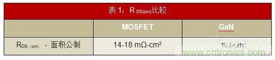 • 较低的RDS(on):如表1所示,GaN的MOSFET面积为RDS(on)的一半。这直接使电路中传导损耗降低了50%。因此,您可以在设计中使用较小的散热器和更简单的热管理。
