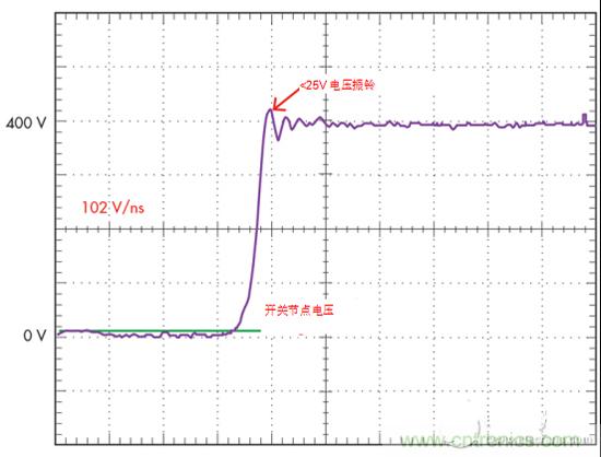 2.如通过优化的驱动器设计的GaN开关波形所证明的,GaN可以非常高速的转换速率工作,并且使交换节点上的振铃最小。