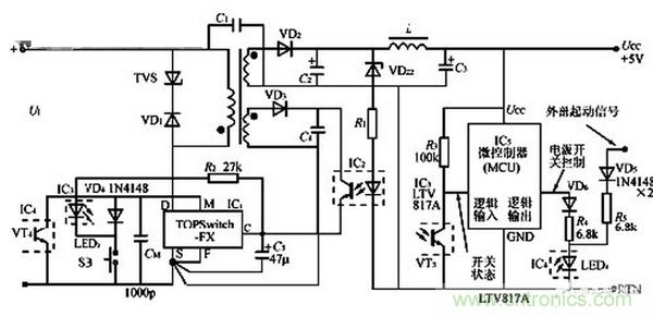 开关电源部分主要由TOP Switch FX(IC1)、光耦合器(IC2)组成。控制电路则包括微控制器(MCU)、两片LTV817A线性光耦合器(IC3、IC4)、按钮开关SB。仅当按下SB时产生的信号才有效,抬起时信号不起作用。SB上不需要加防抖动电路,这是因为开关电源的软起动时间(约10ms)和MCU的复位及初始化时间能起到延迟作用,可以避开按下SB时产生抖动干扰的时间;并且仅当开关被按下至少达到上述时间,才能通过MCU接通开关电源。这就要求必须将SB按到底,而不要轻轻点击一下,以确保电源起动。