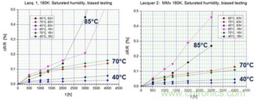图 4 显示了采用“漆 1”涂层的高阻值薄膜电阻器(MELF MMA0204,180 kΩ)的性能。