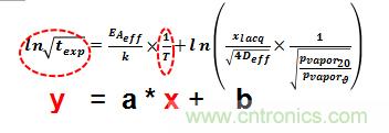 这个一般描述可解释为直线函数 y = ax + b,其中 y 代表暴露时间 texp 的 ln√,x 代表 1/T(= 绝对温度 T [开尔文] 的倒数),如图 3 所示。