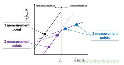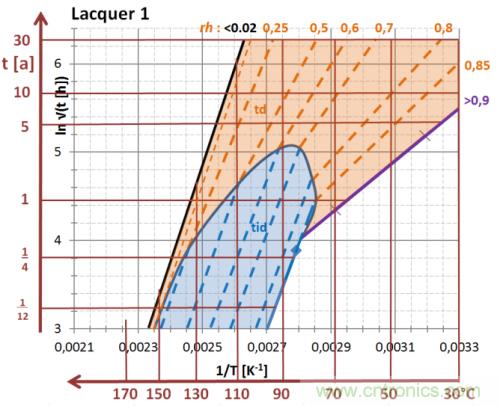 由于标准化的暴露时间 ln√texp 是温度倒数 1/T 的直接函数,所以可用一个图表,亦即用 ln√t – 1/T 图描述和总结元件在整个温度-湿度-时间域中的性能和健康预测,以及其系统特征鉴定: