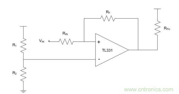 下面的例子所示为安森美半导体TL331配置为一个反相施密特触发器。L331是无内部滞回的单通道、低功耗、集电极开路的比较器。由R1和R2电阻创建的电阻分压器在非反相引脚上设置参考电压,在比较器输出开关处设置阈值电压。由于这是一个集电极开路的比较器,所以连接一个上拉电阻到输出。反馈电阻通过正反馈增加滞回。通常情况下,使用一个比较大的反馈电阻值,至少100 KΩ。