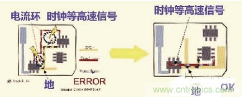 所有的高速信号必须有良好的回流路径。尽可能地保证时钟等高速信号的回流路径最小。否则会极大的增加辐射,并且辐射的大小和信号路径和回流路径所包围的面积成正比。