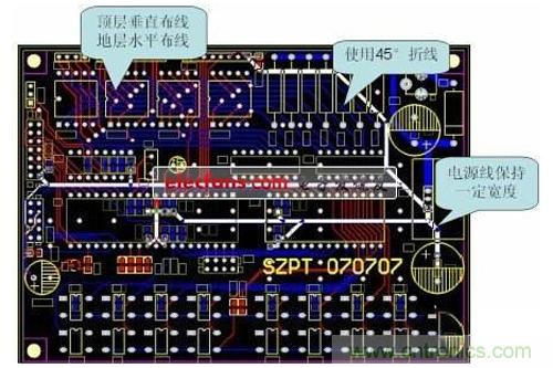 (2)合理安排接口元器件的位置和方向。一般来说,作为电路板和外界(电源、信号线)接的连接器元器件,通常置在电路板的边缘,如串口和并口。放在电路板的中央,不利于接线,也可能因为其他元器件的阻碍而无法连接。另外还要注意接口的方向,使连接线可以顺利地引出,远离电路板。接口放置后,应当利用接口元器件的String(字符串)清晰地标明接口的种类;对于电源类接口,应当标明电压等级,防止因接线错误导致电路板烧毁。