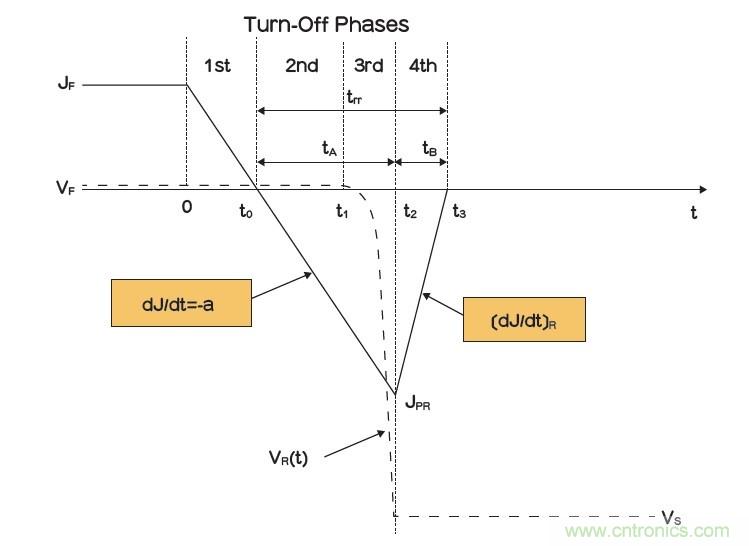 当二极管正向偏压变成反向偏压时,电流不会立即降至零值,因为消除通态期间储存的电荷需要时间。因此,当t=t0时,二极管开始换向操作,电流开始下降,下降斜率(-a)恒定,外部电感和电源电压是决定斜率的唯一因素。在t1之前,二极管被施加正向偏压,从t1t2,二极管压降上升,达到电源电压;在t=t2时,反向电流达到最大值。间隔(t3-t0)被称为反向恢复时间(trr),而负电流与零线之间的区域是反向恢复电荷(Qrr)。tB期间的电流斜率主要与产品设计和硅特性有关。