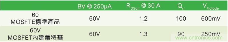 当只有优化QrrVF,diode才能提高系统总体性能时,集成肖特基二极管的新60V MOSFET是一个正确选择。图3列出了标准MOSFET和集成肖特基的功率开关的主要电参数(两款产品的BVDSS和芯片尺寸相同)。
