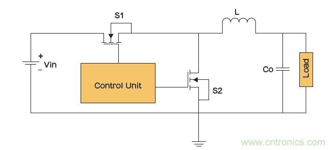在一个同步降压转换器(图4)内,集成肖特基二极管的功率MOSFET可以用作下桥臂开关(S2),以提高转换器的总体性能。
