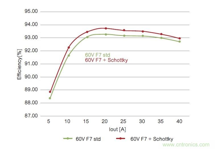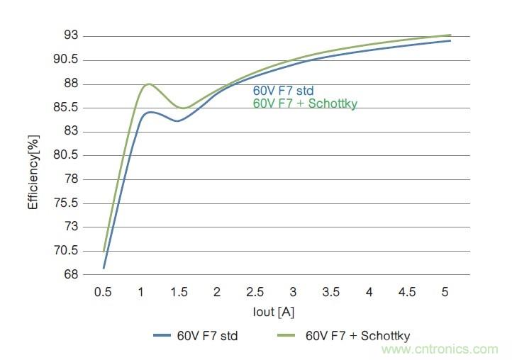 在两个拓扑内,60V内置肖特基二极管的器件在整个电流范围内性能表现更好,从而提高了系统总体性能。