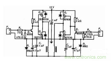 是由两只p沟道MOSFET。Q1、Q2和两只n沟道MOSFET Q5、Q6组成。在这里没有采用4只n沟道MOSFET,原因是驱动电路复杂,如果采用上面的驱动电路接近电源的两个导体管不能完全导通,发热量为接近地一侧导体管4倍以上,功耗增加,所以采用对管逆变即减小了功耗,而且驱动电路简单。通过控制4个导体管的开关速度再通过低通滤波器即可实现DC/AC功能。