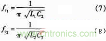 两个肖特基整流二极管1N5822为续流二极管,这里为防止产生负电压,C2、C3、C4、C5、L1、L2组成低通滤波器,其中C5、C6为瓷片电容,C2、C3用电解电容,充放电电流可以流进地,L1、L2为带铁芯的电感,带铁芯的电感对高频的抑制比空心电感更好,电感值更高。关于参数的选取和截止频率的计算如下