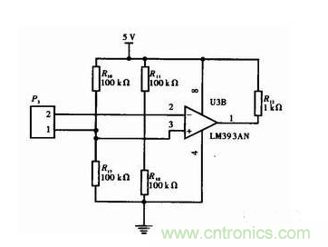 由于终端负载一定,所以电流采样实际等同于一个峰值检测的过程,此电路实际是一个峰值检测电路,P3为信号的2个输入端,调整R10,R11和R17、R18取值来实现峰值测功能,电路中的阻值并不准确,需要实际中根据信号的幅值来调整R10、R11和R17、R18阻值和比值。R14、R15、R19、R20的电流为模拟比较器内部偏置电流的10倍以上,电阻的阻值尽可能大,这样既减小了功耗也保证了系统的稳定性。Y3采用模拟比较器LM393,LM393内部为开集电极输出,应用的时候输出端要接一个上拉电阻,电路如图3所示。
