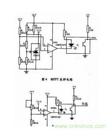 模拟比较器LM393的正相输入端3脚位固定电压7.5 V,正常状态下PD4采集到的为高电平,当2脚的电压高于7.5 V时输出端1脚输出低电平,光耦导通,PD4采集到的为低电平开始处理SPWM信号调整输出阻抗来实现恒电压跟踪,最终实现最大功率点跟踪。电路如图4所示。