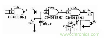 此部分电路的设计采用双输入四与非门CD4011做反相器、开关二极管D6、电阻R27、电解电容C10、三极管2N3904和继电器。R26的选取由继电器的驱动电流和2N3904的放大倍数β来决定,过小则增加功耗,过大则不能驱动继电器。R27和C10的放电时间就是系统过流欠压?;ず蠹觳獾募涓羰奔洹J奔銽=2×R27×C10。