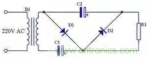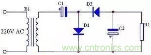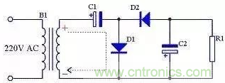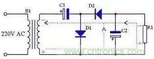 前面介绍的三种整流电路输出电压都小于输入交流电压的有效值,如果需要输出电压大于输入交流电压有效值时可以采用倍压电路,见图12。由图13可知,在电源的正半周,变压器B1次级上端为正下端为负,D1导通,D2截止,C1通过D1充电,充电后C1两端电压接近B1次级电压峰值,方向为左端正右端负;由图14可知,在电源的负半周,变压器B1次级上端为负下端为正,D1截止,D2导通,C2通过D1充电,充电后C2两端电压接近C1两端电压与B1次级电压峰值之和,方向为下端正上端负。由于负载R1与C1并联,当R1足够大时,R1两端的电压即为接近2倍B1次级电压。