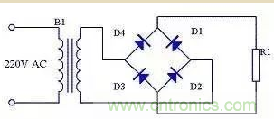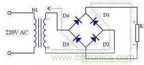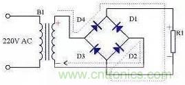 由于全波整流电路需要特制的变压器,制作起来比较麻烦,于是出现了一种桥式整流电路。这种整流电路使用普通的变压器,但是比全波整流多用了两个整流二极管。由于四个整流二极管连接成电桥形式,所以称这种整流电路为桥式整流电路。