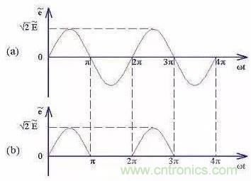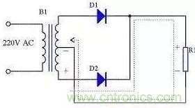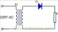 半波整流电路见下图。其中B1是电源变压器,D1是整流二极管,R1是负载。B1次级是一个方向和大小随时间变化的正弦波电压,波形如图2所示。0~π期间是这个电压的正半周,这时B1次级上端为正下端为负,二极管D1正向导通,电源电压加到负载R1上,负载R1中有电流通过;π~2π期间是这个电压的负半周,这时B1次级上端为负下端为正,二极管D1反向截止,没有电压加到负载R1上,负载R1中没有电流通过。在 2π~3π、3π~4π等后续周期中重复上述过程,这样电源负半周的波形被“削”掉,得到一个单一方向的电压,波形如图3所示。由于这样得到的电压波形大小还是随时间变化,我们称其为脉动直流。