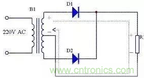 由于半波整流电路的效率较低,于是人们很自然的想到将电源的负半周也利用起来,这样就有了全波整流电路。全波整流电路图见图4。相对半波整流电路,全波整流电路多用了一个整流二极管D2,变压器B1的次级也增加了一个中心抽头。这个电路实质上是将两个半波整流电路组合到一起。在0~π期间B1次级上端为正下端为负,D1正向导通,电源电压加到R1上,R1两端的电压上端为正下端为负,其波形如图5所示,其电流流向如图6所示;在π~2π期间B1次级上端为负下端为正,D2正向导通,电源电压加到R1上,R1两端的电压还是上端为正下端为负,其波形如图5所示,其电流流向如图7所示。在2π~3π、3π~4π等后续周期中重复上述过程,这样电源正负两个半周的电压经过D1、D2整流后分别加到R1两端,R1上得到的电压总是上正下负,其波形如图5所示。