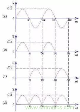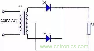 全波整流电路每个整流二极管上流过的电流只是负载电流的一半,比半波整流小一倍。