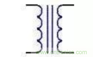 通常直流稳压电源使用电源变压器来改变输入到后级电路的电压。电源变压器由初级绕组、次级绕组和铁芯组成。初级绕组用来输入电源交流电压,次级绕组输出所需要的交流电压。通俗的说,电源变压器是一种电→磁→电转换器件。即初级的交流电转化成铁芯的闭合交变磁场,磁场的磁力线切割次级线圈产生交变电动势。次级接上负载时,电路闭合,次级电路有交变电流通过。变压器的电路图符号见图1。
