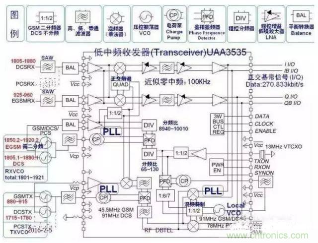 1.收发器(Transceiver)收发器即调制解调器调制:发射时基带信号加载到射频信号解调:接收时射频信号过滤出基带信Transceiver根据其工作频率可分为:单频、双频、三频等Transceiver根据其中频特征可分为有中频、零中频、近零中频等以DB2009为例介绍Transceiver UAA3535的内部结构UAA3535是近零中频收发器,它最多可以作三频收发它内部有:三个PLL(包括一个内置VCO)、正交混频解调器、可控增益低噪放大器、混频调制器等它需外接:13MHz参考基准时钟、RXVCO、TXVCO、基带控制信号等我们需要研究其内部各重要节点的频率、带宽,信号转换的流程等细节