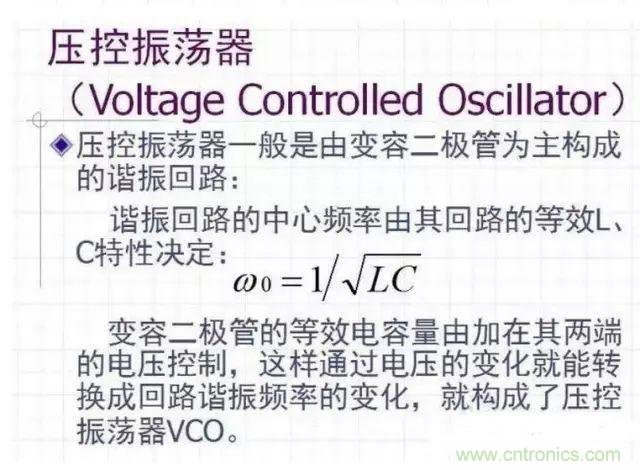 VCO的选择要素:● High spectral purity● Linear voltage-frequency transfer characteristic● Good frequency stability to temperature● Frequency deviation capability 》》the max. PLL capture range● Time response● Low power consumption and Output level● Output harmonic level and tuning sensitivity● Phase noise