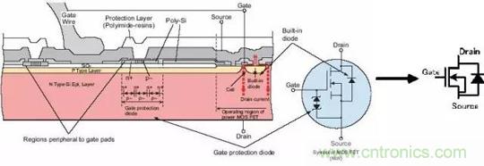 至于为什么不使用耗尽型的MOS管,不建议刨根问底。对于这两种增强型MOS管,比较常用的是NMOS。原因是导通电阻小且容易制造。所以开关电源和马达驱动的应用中,一般都用NMOS。下面的介绍中,也多以NMOS为主。在MOS管原理图上可以看到,漏极和源极之间有一个寄生二极管。这个叫体二极管,在驱动感性负载(如马达),这个二极管很重要。顺便说一句,体二极 管只在单个的MOS管中存在,在集成电路芯片内部通常是没有的。下图是MOS管的构造图,通常的原理图中都画成右图所示的样子。 (栅极?;び枚苡惺辈换?/div>