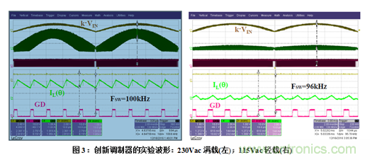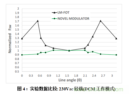 具体地讲,图3所示是开关频率在宽输入电压(230Vac-左和115Vac-右)范围和所有负载条件中(CCM-左, DCM - 右)保持恒定。与标准LM-FOT方法相比,本文提出的创新调制器的性能大幅改进,特别是在高压线DCM运行模式更为明显,如图4所示。